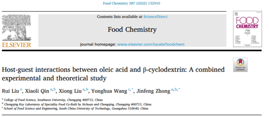 2019级“百超”创新实验班本科生刘瑞在Food Chemistry发表了题为“Host-guest interactions between oleic acid and β-cyclodextrin: A combined experimental and theoretical study”的研究论文。该文指导教师、通讯作者为钟金锋副教授。全文链接://doi.org/10.1016/j.foodchem.2022.132910
