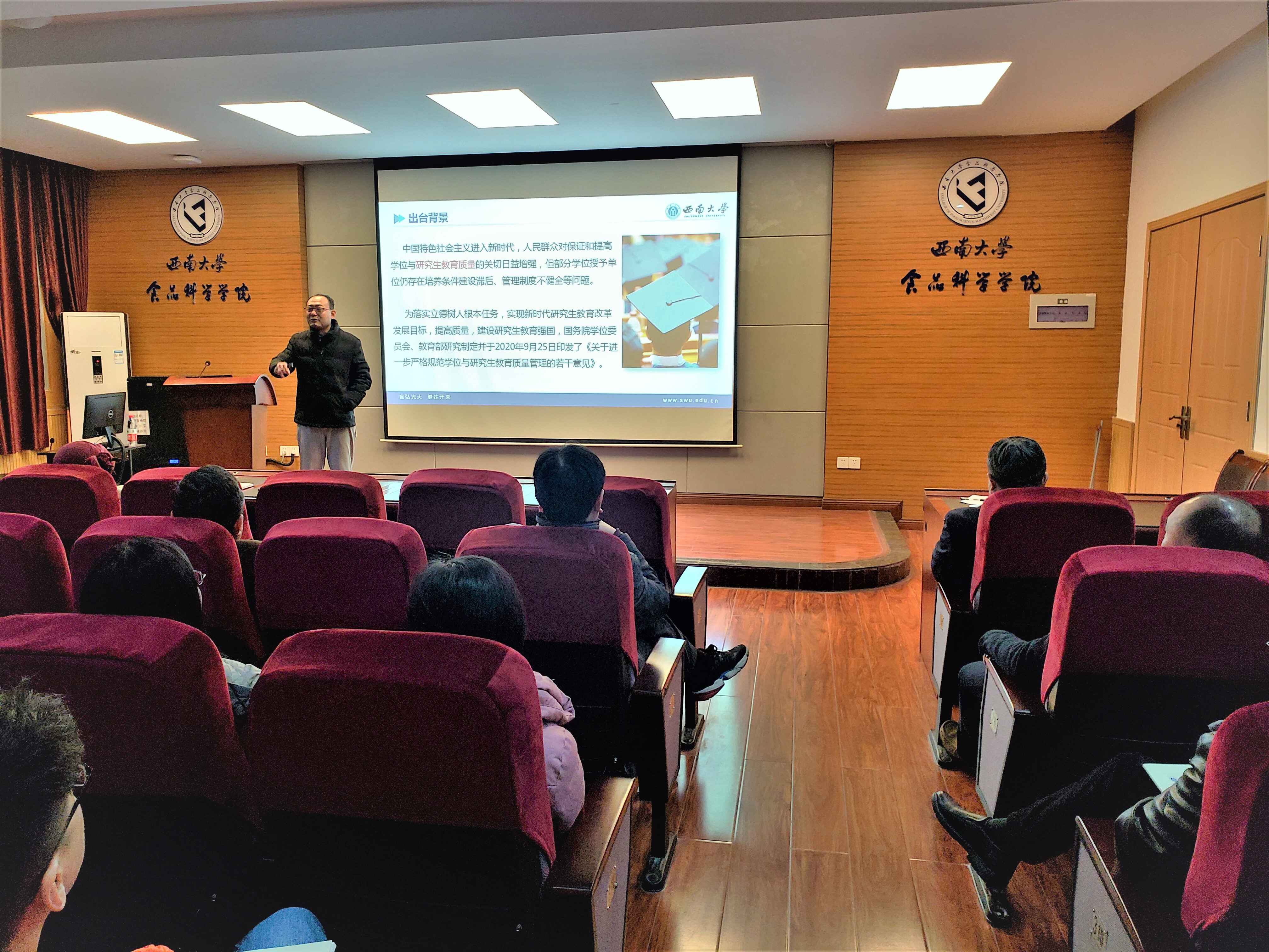 随后,会议学习了《国务院学位委员会教育部关于进一步严格规范学位与研究生教育质量管理的若干意见》(学位〔2020〕19 号)文件要求,导师应指导研究生潜心读书学习、了解学术前沿、掌握科研方法、强化实践训练,加强科研诚信引导和学术规范训练,掌握学生参与学术活动和撰写学位论文情况,增强研究生知识产权意识和原始创新意识,杜绝学术不端行为。不安排研究生从事与学业、科研、社会服务无关的事务。关注研究生个体成长和思想状况,与研究生思政工作和管理人员密切协作,共同促进研究生身心健康。