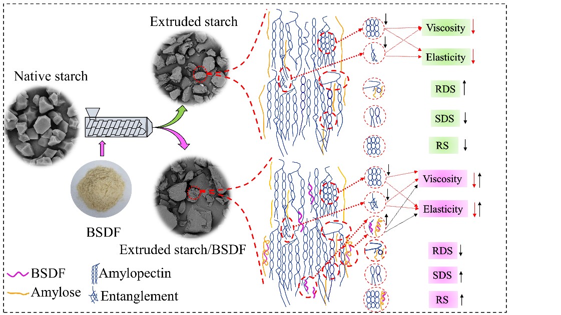 图1 挤压加工过程中BSDF调控淀粉性能的机制示意图