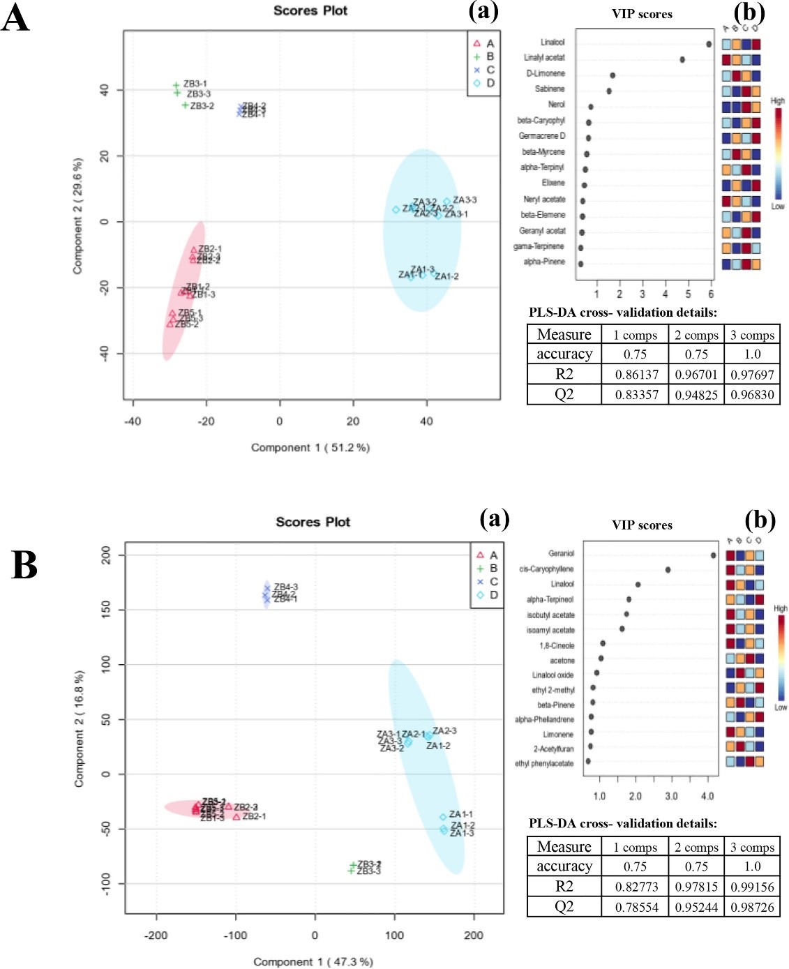 1. 偏最小二乘-判别分析(PLS-DA)图。A.GC-MS,B.GC-IMS