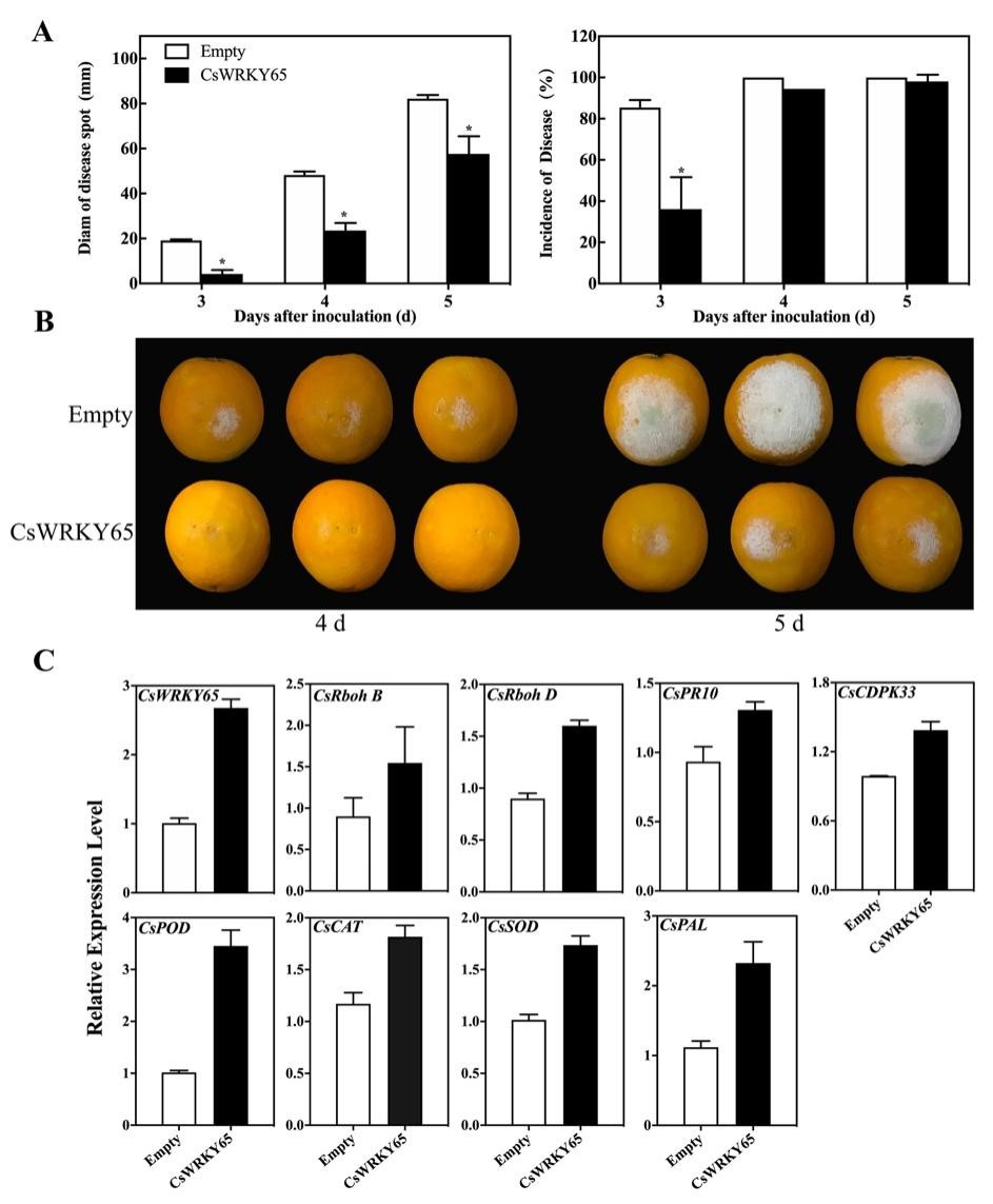 2 柑橘果皮中瞬时过表达CsWRKY65增强对绿霉病的抗病性