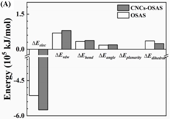 4各项相互作用能对纤维素纳米晶与淀粉酯结合过程的贡献(A)MD模拟中淀粉酯与淀粉酯、纤维素纳米晶与淀粉酯之间的氢键数目(B)