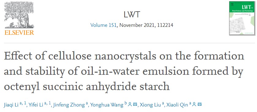 此外,富含不饱和脂肪酸的油脂存在水溶性差、生物利用率缺点,通过纳米技术获得功能性油脂纳米乳液是提高油脂生物利用度的有效途径之一。通过理论计算研究组分之间的相互作用,为从分子水平阐明乳液的形成与稳定机理提供理论支撑,相关成果发表在国际期刊LWT-Food Science and Technology。结果表明,当纤维素纳米晶与淀粉酯(质量比为28)和亚麻籽油的浓度分别为1.5 wt%10 wt%时,形成相对稳定的Pickering乳液。较强的分子间相互作用(静电作用)有利于形成更稳定的纤维素纳米晶-淀粉酯复合物。这种相互作用可能对以纤维素纳米晶为稳定剂和淀粉酯为乳化剂制备的Pickering乳液的稳定性有一定贡献。