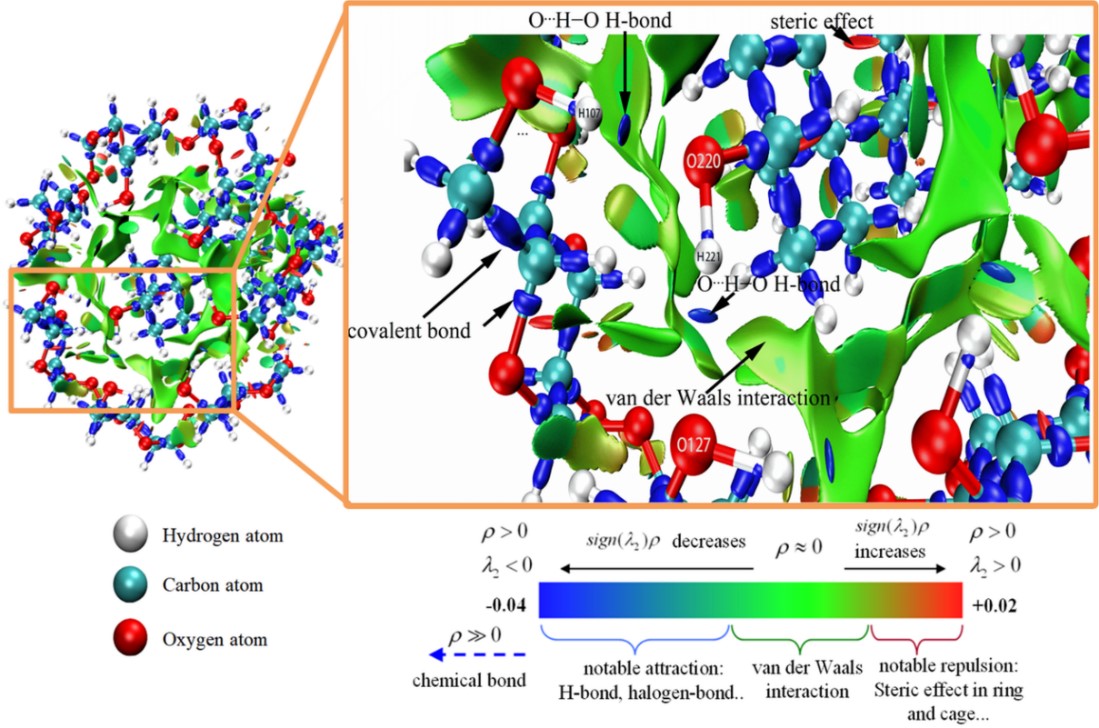 这项研究采用实验手段和理论计算相结合的方法定量研究胆固醇-β-环糊精包合物的形成及其相互作用机制。结果表明,β-环糊精与胆固醇以1:1的摩尔比形成包合物,通过红外光谱和理论光谱证实了包合物的形成。热重分析结果表明该包合物的热稳定性有所提高(包合物327.3°C vs. 物理混合物321.6 °C)。其次,通过理论计算定量分析了β-环糊精与胆固醇之间的相互作用,结果表明范德华力中的色散能(283.31 kJ/mol)对总相互作用能(204.72 kJ/mol)的贡献最大,β-环糊精与胆固醇之间形成了2个氢键,这意味着范德华和氢键是驱动包合物自发形成和保持包合物稳定性所必需的。该研究通过计算和实验方法深入揭示了胆固醇-β-环糊精包合物的形成机制,为从食品体系中去除胆固醇提供了理论依据。