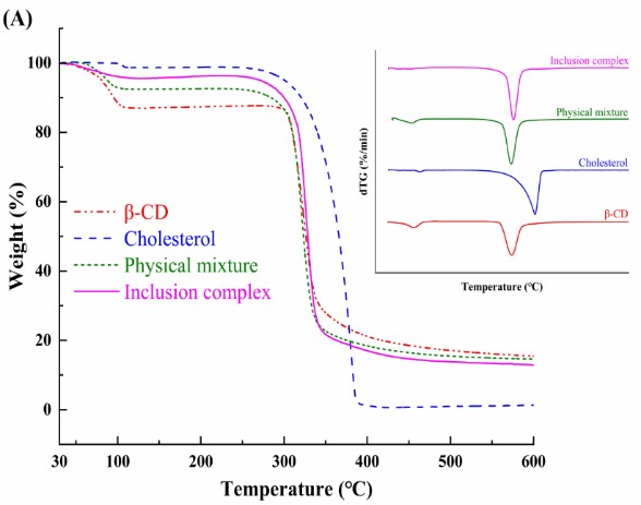 1  β-环糊精、胆固醇、物理混合物和胆固醇-β-环糊精包合物的TG/DTG曲线(A)DSC曲线(B)