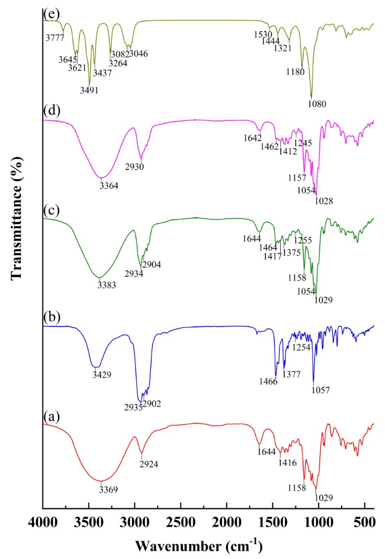2 β-环糊精(a)、胆固醇(b)、物理混合物(c)、包合物(d)、最稳定构象的理论红外光谱(e)