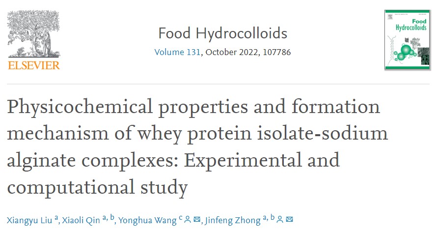 钟金锋博士近期在食品领域国际知名期刊《Food Hydrocolloids》(IF=9.147)在线发表了题为“Physicochemical properties and formation mechanism of whey protein isolate-sodium alginate complexes: Experimental and computational study”的研究论文,2019级硕士生刘祥雨为第一作者,三级a片