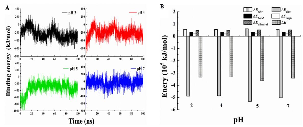 图4. β-乳球蛋白-海藻酸钠复合物在pH 2.0–7.0下的结合能(A)和能量贡献(B)