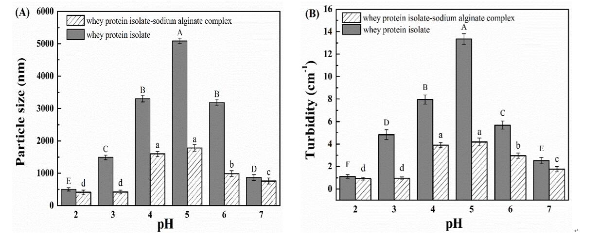 图1.乳清分离蛋白和乳清分离蛋白-海藻酸钠复合物在pH 2.0–7.0的粒径(A)和浊度(B)