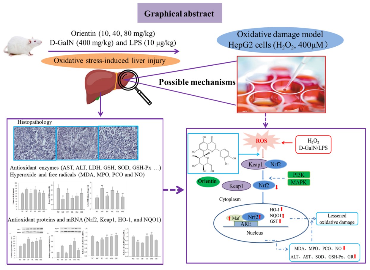 活性氧(ROS)是引发的肝脏氧化应激是肝脏疾病发生和发展的根本原因之一。 机体自身的抗氧化防御体系,主要包括酶/非酶抗氧化系统。酶抗氧化系统包括过氧化氢酶(CAT)、超氧化物歧化酶(SOD)、谷胱甘肽还原酶(GR)等,亦是第一道防御线。然而,在过量ROS诱发强烈氧化应激作用下,第一道防御体系不足以应对。膳食抗氧化因子例如多酚类、维生素类等外源性因素构成的非酶抗氧化系统,在维持机体氧化应激平衡方面发挥重要作用。荭草素(Orientin)是一种黄酮碳苷类化合物,主要分布于百香果和多种中草药中,具有抗癌细胞迁移,以及改善肺损伤或细胞损伤等药理作用。然而,荭草素对肝脏损伤的保护作用及其潜在机制尚不清楚。因此,本实验研究了荭草素对D-GalN/LPS诱导的小鼠急性肝损伤的保护作用。采用H2O2氧化损伤HepG2细胞模型,解析荭草素对PI3K/Akt和p38/MAPK信号通路中抗氧化相关因子蛋白和基因表达的影响,深入探究荭草素缓解肝损伤的作用分子机制。