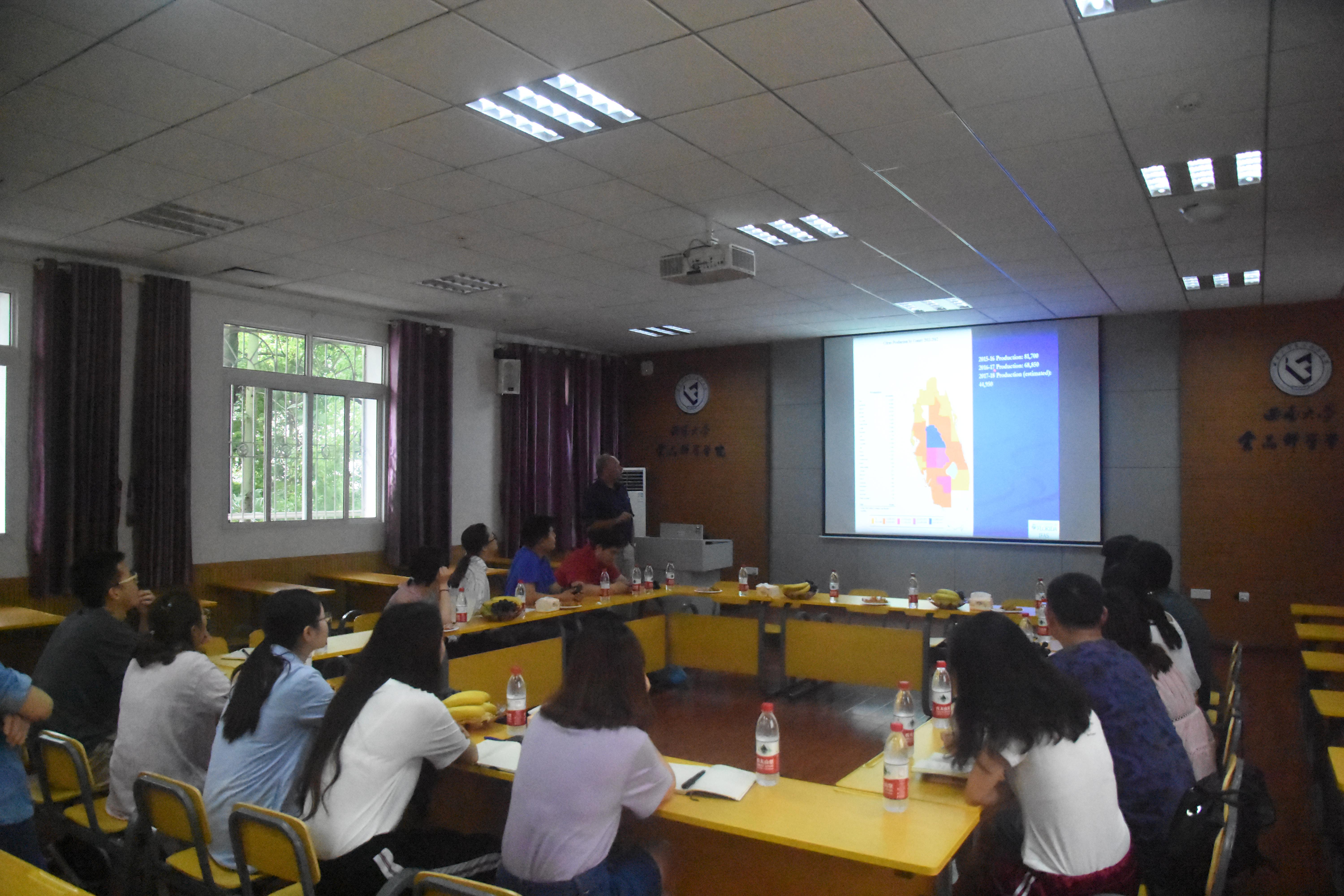 会议开始,Mark Ritenour教授以美国佛罗里达的柑橘商品化生产流程为切入点展开会议内容。他分享了美国佛罗里达的整个柑橘商品化生产流程,并生动形象地讲解了各个环节的操作方法以及目的。随后,Mark Ritenour教授以他所在实验室的研究成果为基础,为在座师生讲解了精油和蜡在柑橘采后病害控制方面的应用和作用。并对柑橘黄龙病(HLB)进行了简要的介绍。最后,Mark Ritenour教授与在座师生共同探讨了关于柑橘采后病害以及柑橘采后商业化处理方面的问题。会议结束后,Mark Ritenour教授和在座师生合影留念。