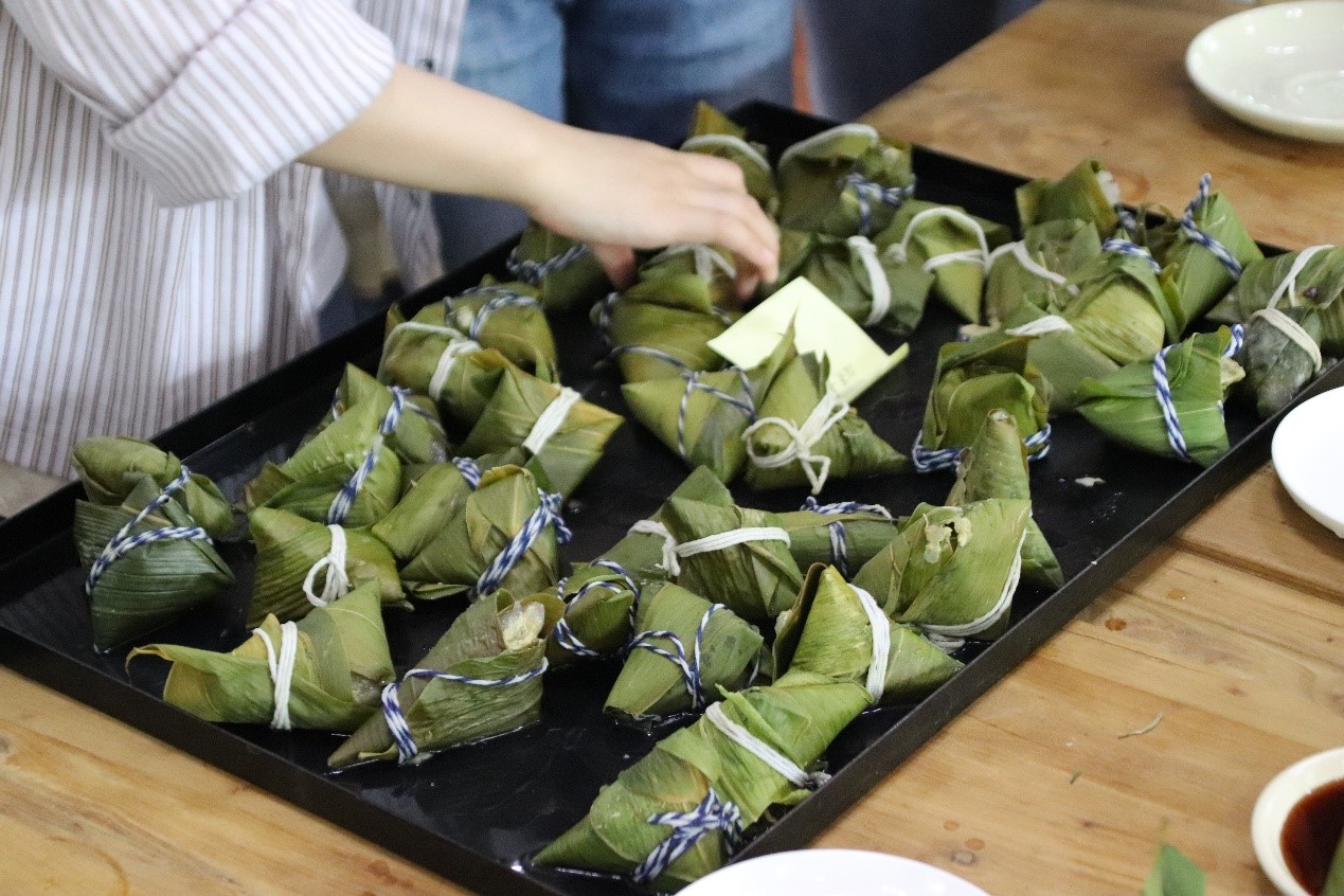 活动以端午诗朗诵的形式拉开帷幕,在诗中,品人生百态,览“粽”情湖山。紧接着,进入特色风味粽子的讲解和展示环节,师生一边品尝粽子和酒一边聆听讲解。在包粽子体验环节,在场的老师和学生们都踊跃的参与其中,在劳动中感受端午的习俗和劳动的趣味。
