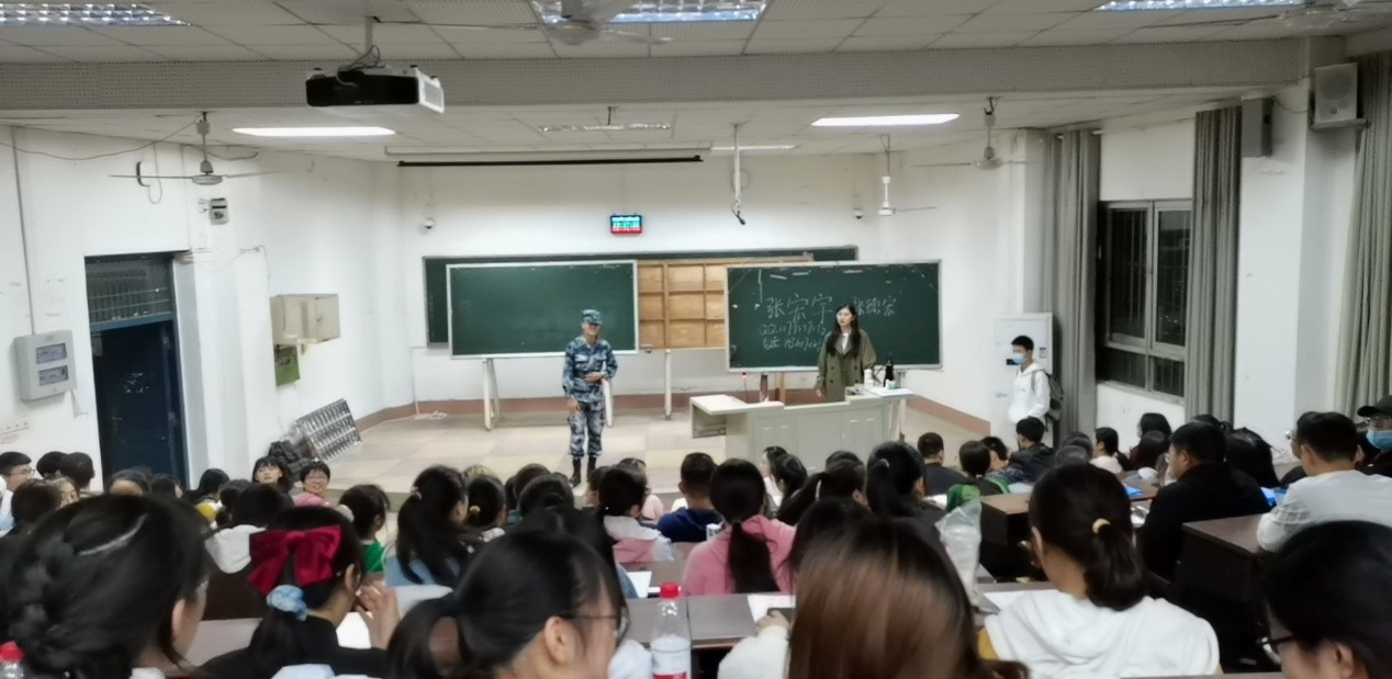 “分散军训”的张宏宇教官(我校砺剑班学员)及2020级全体本科生参加会议。