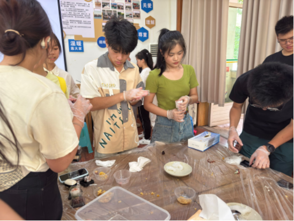 活动中同学们积极参与,按照比例包馅、压模,一系列动作有条不紊。据同学介绍,本次制作的月饼口味由学生自主研发,主要有四种,并且每一种口味都有特殊的寓意。