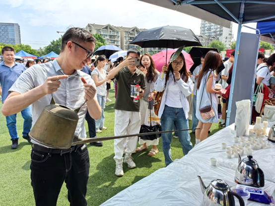 在“非遗项目”体验区准备了糖人糖画、棉花糖、宋代点茶、石磨豆花、冰糖葫芦等经典非遗项目以“可参与、可感知、可分享”的形式,让传统技艺从记忆走进现实,其中宋代点茶体验区,茶香四溢,食品学院学生团队身着宋制汉服,完整复现《大观茶论》中的“七汤点茶法”:从碾茶筛粉到注水击拂,雪白的泡沫在茶盏中堆成“雪顶”,参与者用茶筅勾勒出各式各样的图案,在一冲一搅间对话宋代文人雅趣。