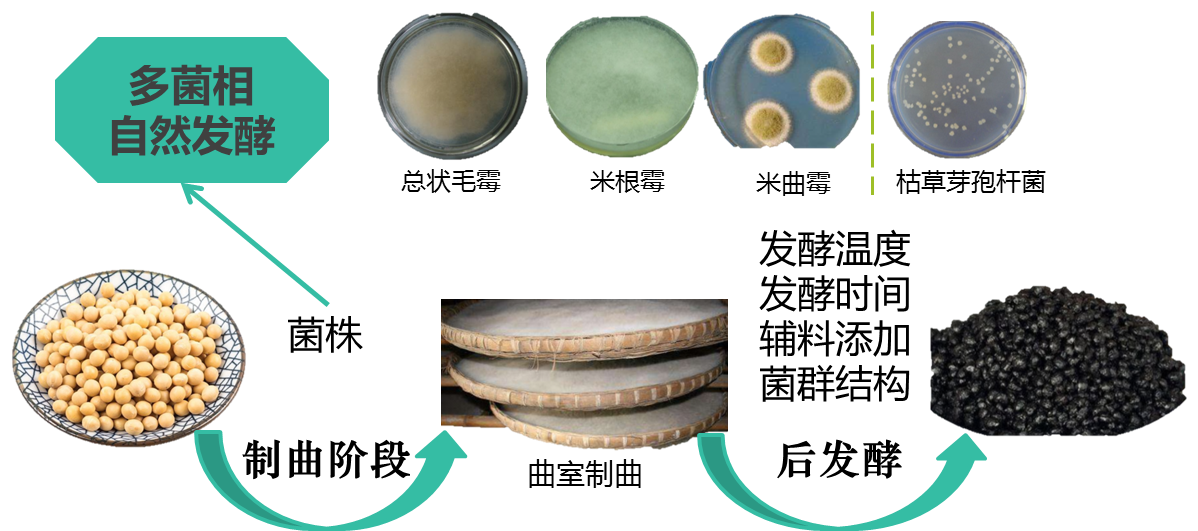 作为我国西南地区特色发酵调味品的永川豆豉,具有“疏松散籽,油亮发黑、味美化渣、清香回甜”的品质特点,其生产工艺主要有两种。毛霉型豆豉生产工艺采用总状毛霉自然制曲,高盐(11%)常温后发酵,需要9-12个月的时间。由于毛霉生长温度低,每年仅在11月至次年2月生产。长达一年的生产周期,对于企业来讲容易造成资金周转困难,厂房与生产设备闲置的问题。另一种低盐速成豆豉生产工艺采用米曲霉纯种制曲,可以实现全年大部分时间制曲。相比之下,生产周期较短,提高了企业资金和厂房设备的利用率。但是豆豉风味却难以保证,与消费者对高品质豆豉的需求产生矛盾。